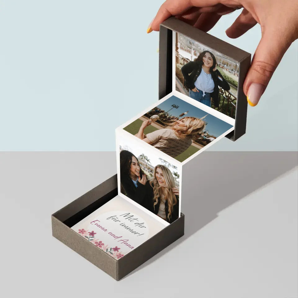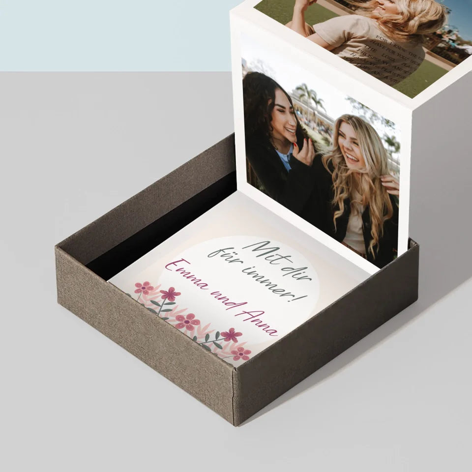 Die Box besteht aus 3 Fotos im Format 6,68 x 6,68 cm und einer personalisierten Karte mit einer persönlichen Widmung.
