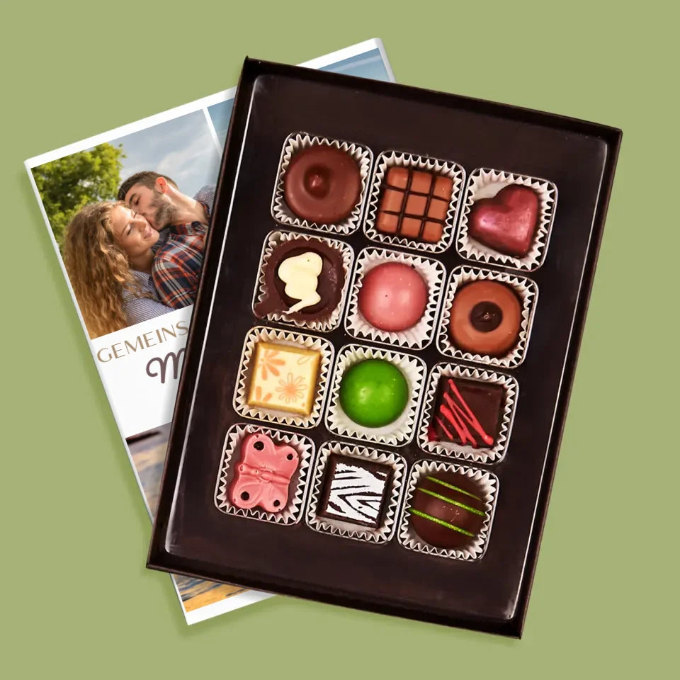 Leckere Pralinen aus belgischer Schokolade in einer eleganten Schachtel, individuell personalisiert.