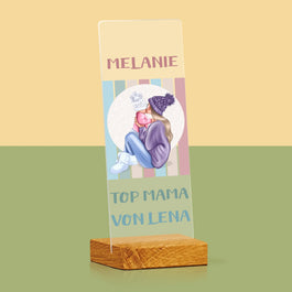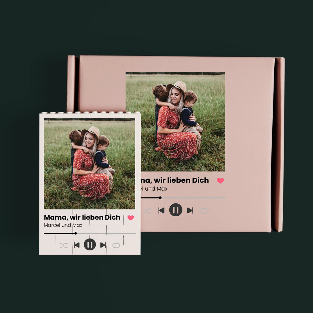 Personalisierter Aufdruck auf den Bausteinen und auf der beigen Schachtel.