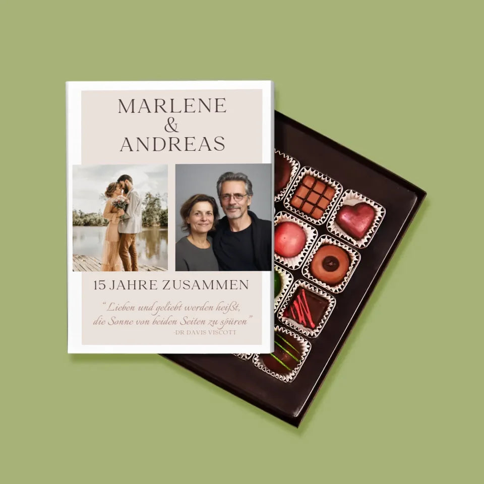 Leckere Pralinen aus belgischer Schokolade in einer eleganten Schachtel, individuell personalisiert.