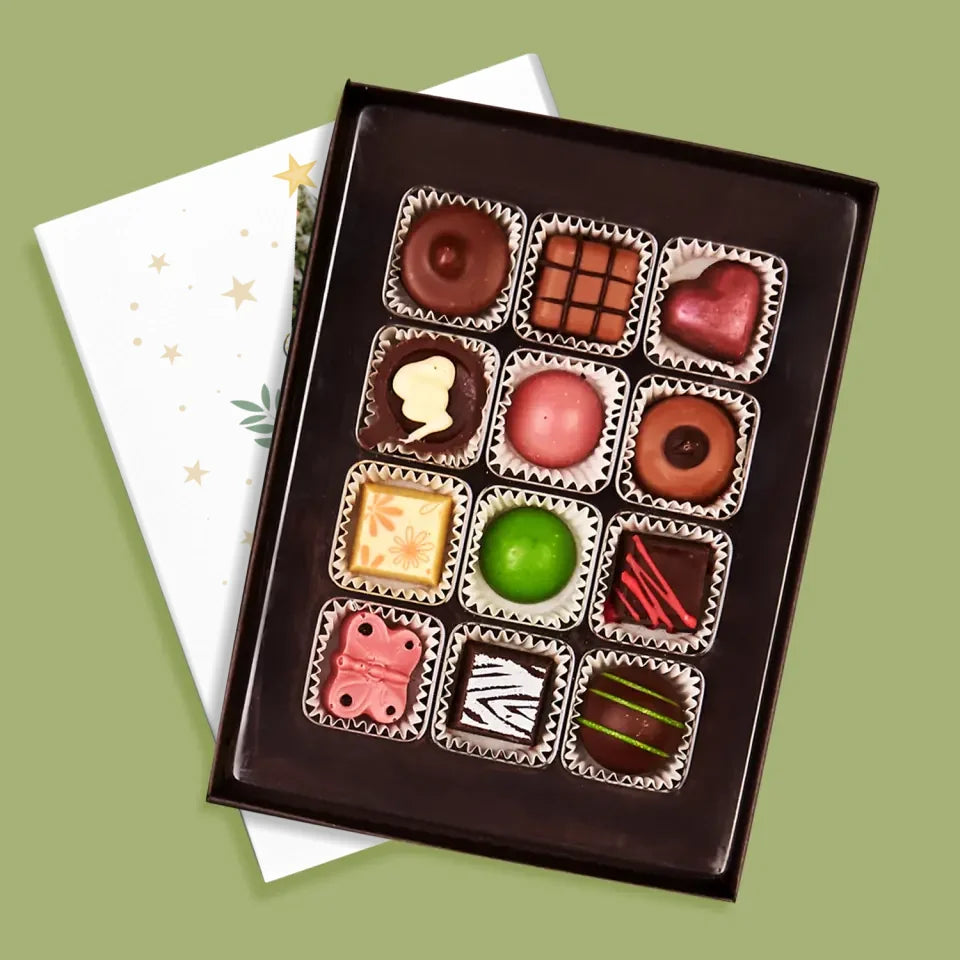 Leckere Pralinen aus belgischer Schokolade in einer eleganten Schachtel, individuell personalisiert.