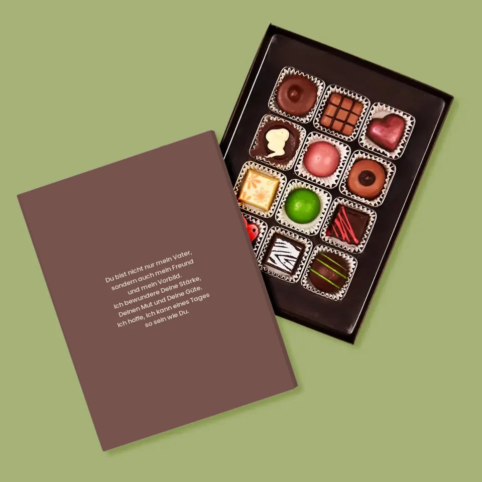 Leckere Pralinen aus belgischer Schokolade in einer eleganten Schachtel, individuell personalisiert.