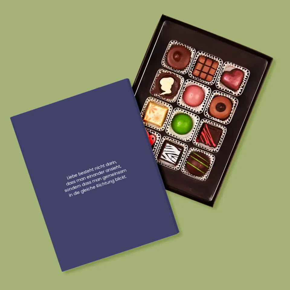 Leckere Pralinen aus belgischer Schokolade in einer eleganten Schachtel, individuell personalisiert.