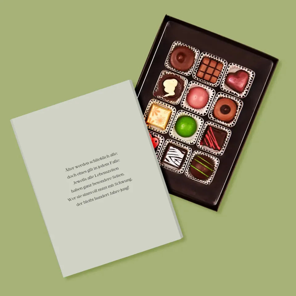 Leckere Pralinen aus belgischer Schokolade in einer eleganten Schachtel, individuell personalisiert.