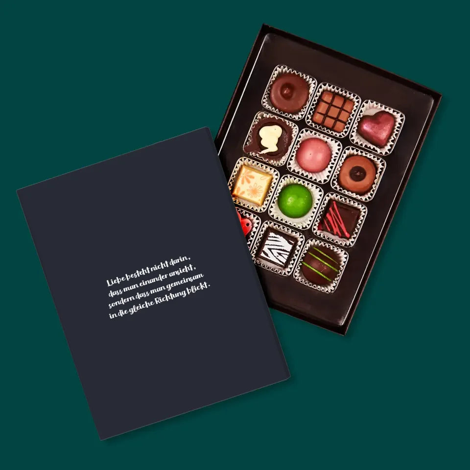 Leckere Pralinen aus belgischer Schokolade in einer eleganten Schachtel, individuell personalisiert.
