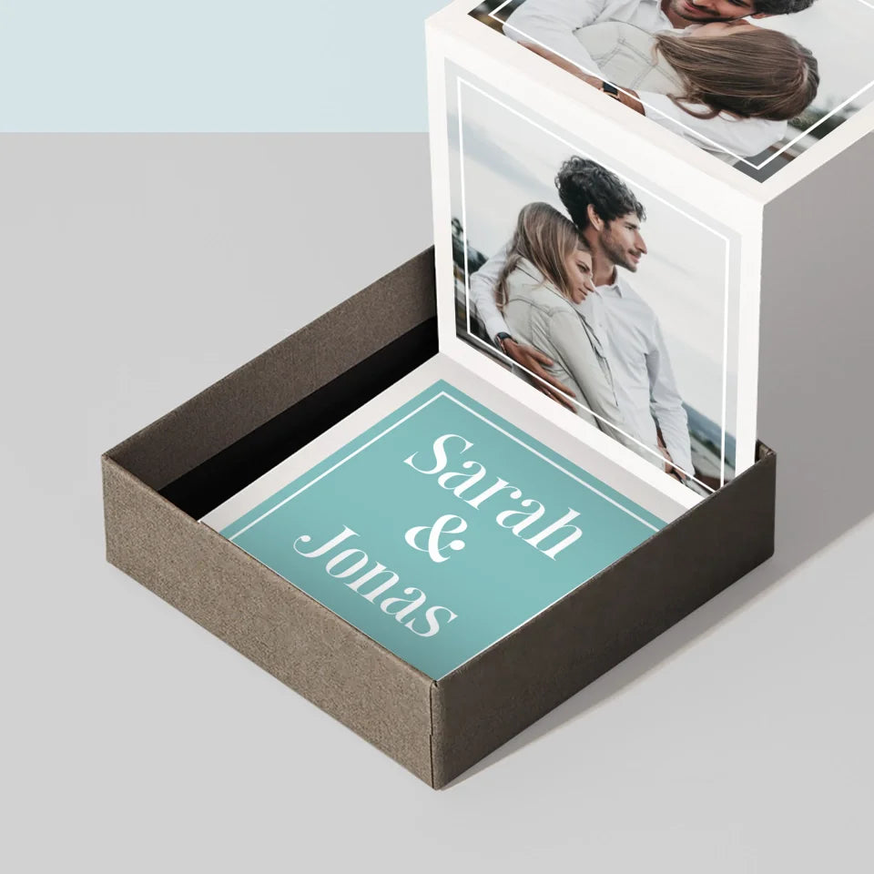 Die Box besteht aus 3 Fotos im Format 6,68 x 6,68 cm und einer personalisierten Karte mit einer persönlichen Widmung.