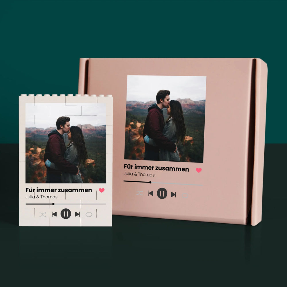 Personalisierter Aufdruck auf den Bausteinen und auf der beigen Schachtel.