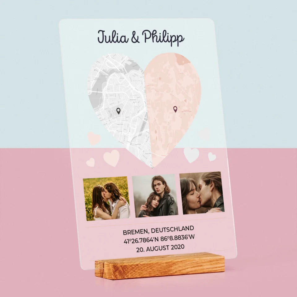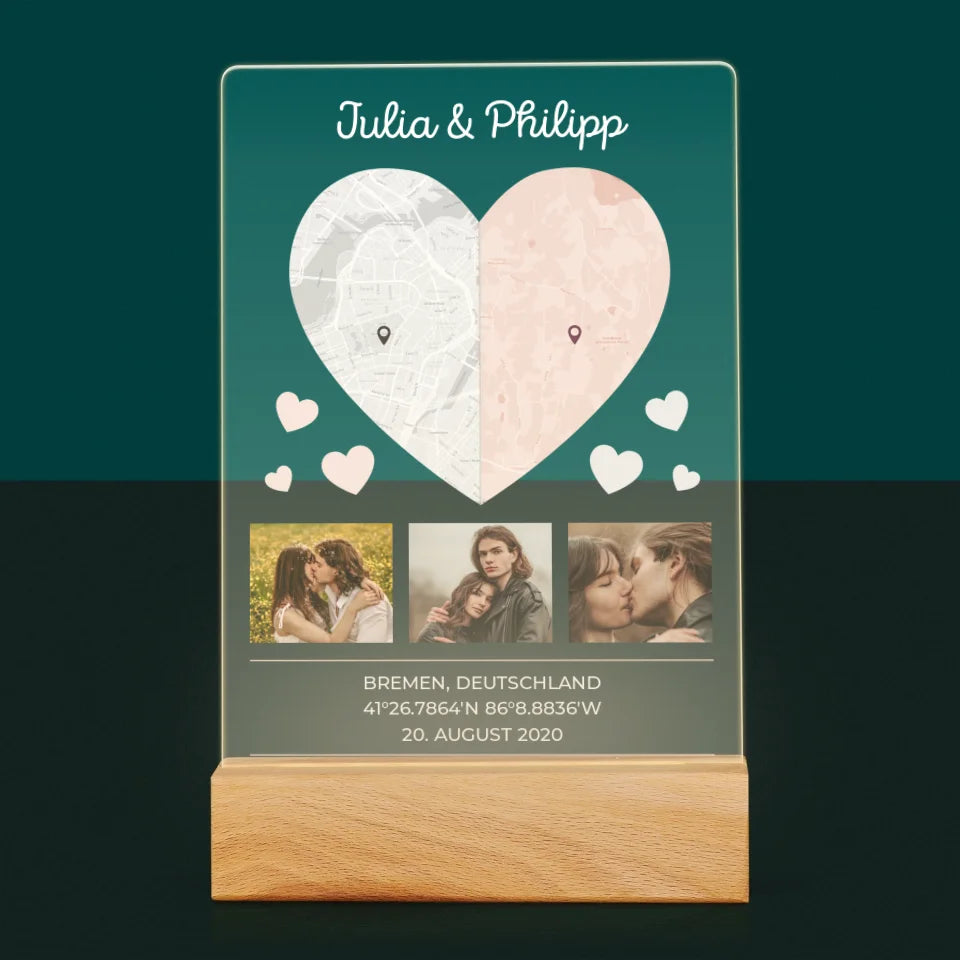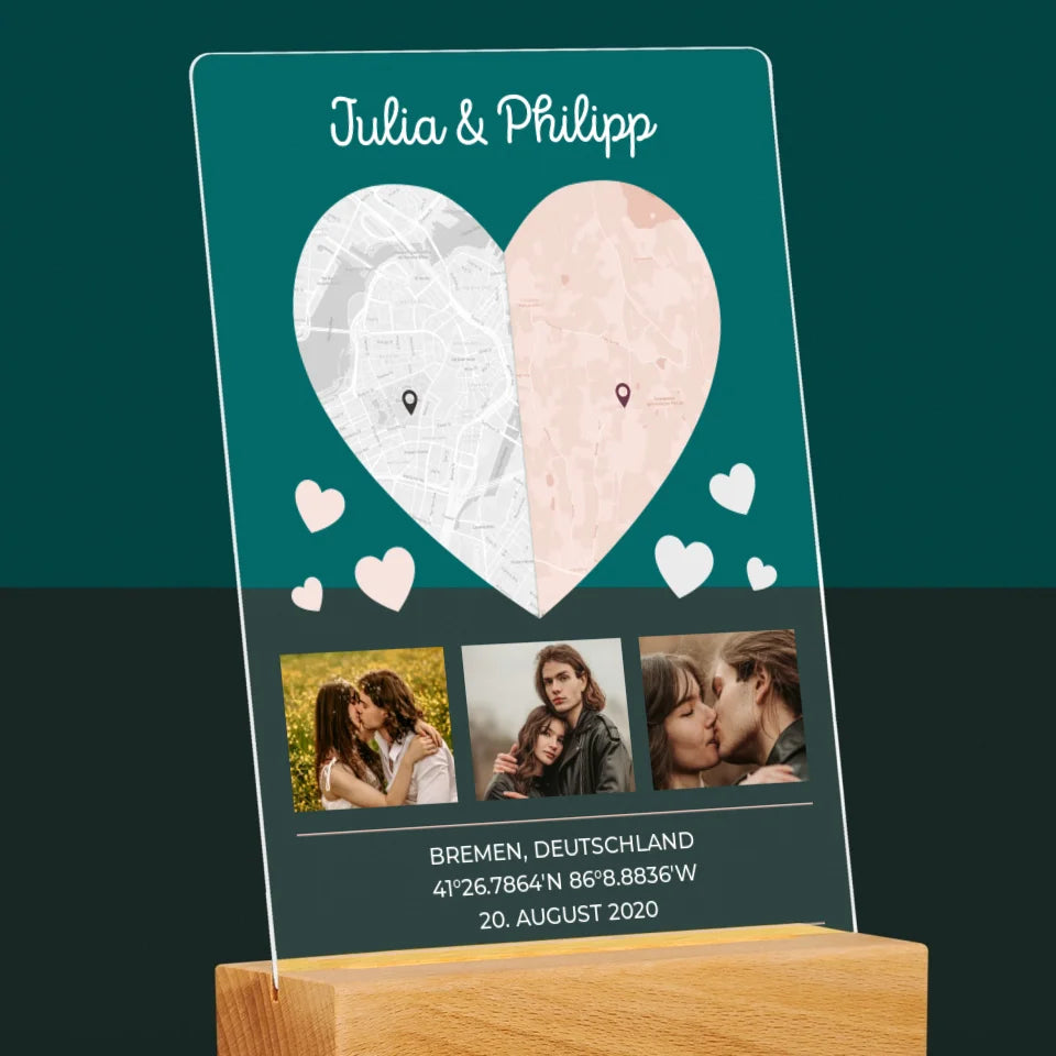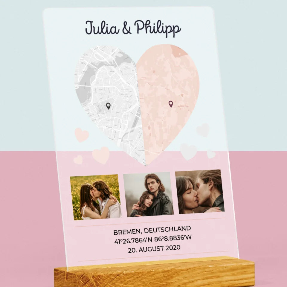 Ihr Standort: Zwei Herzhälften - Druck auf Acrylglas mit LED-Beleuchtung