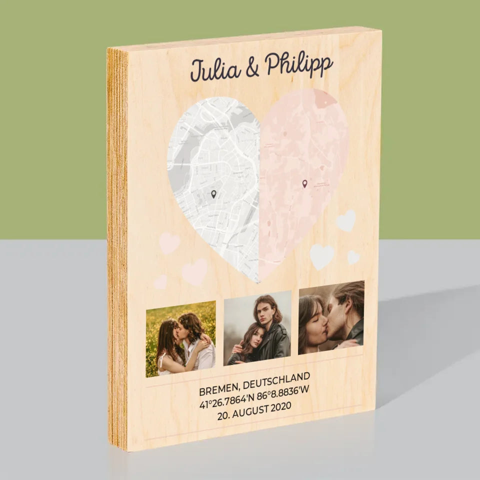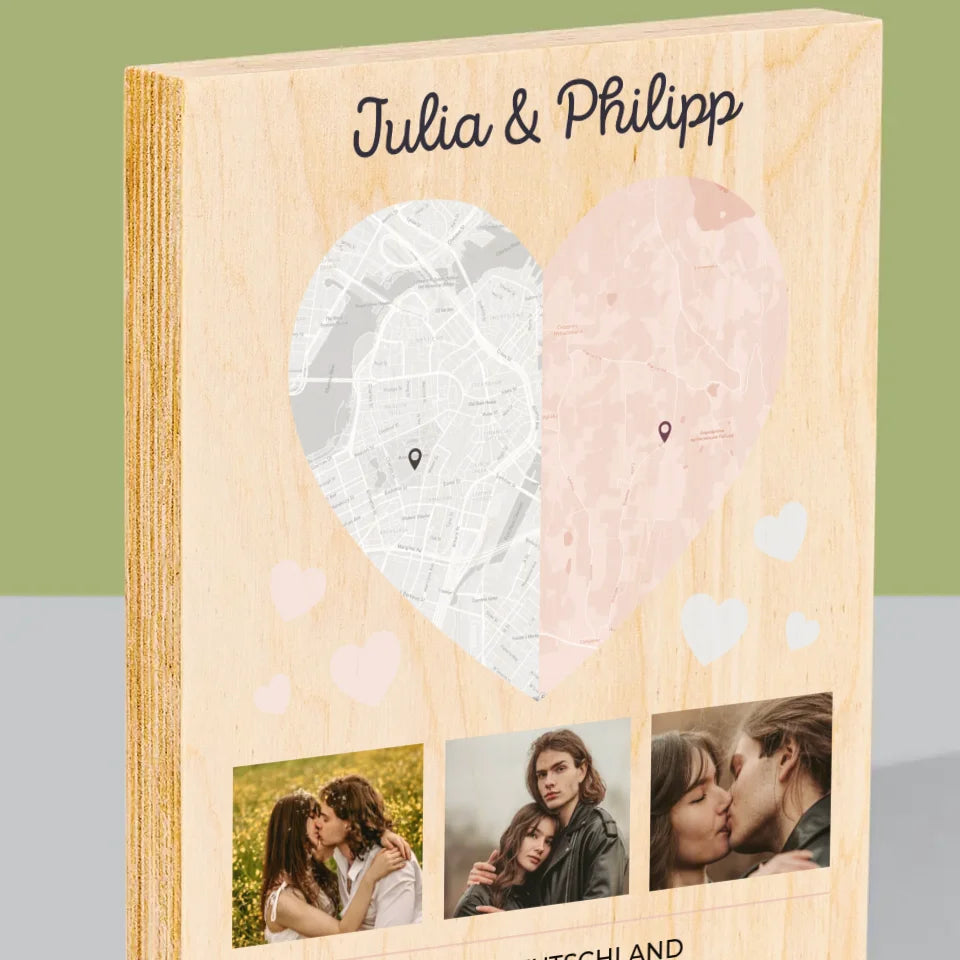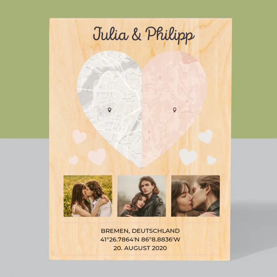 Ihr Standort: Zwei Herzhälften - Druck auf Holz - Vertikal