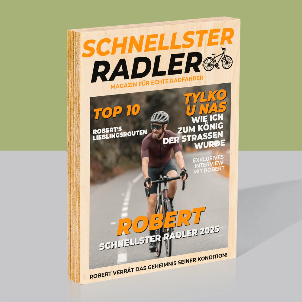 Magazin-Cover: Der Schnellste Radler - Druck auf Holz - Vertikal