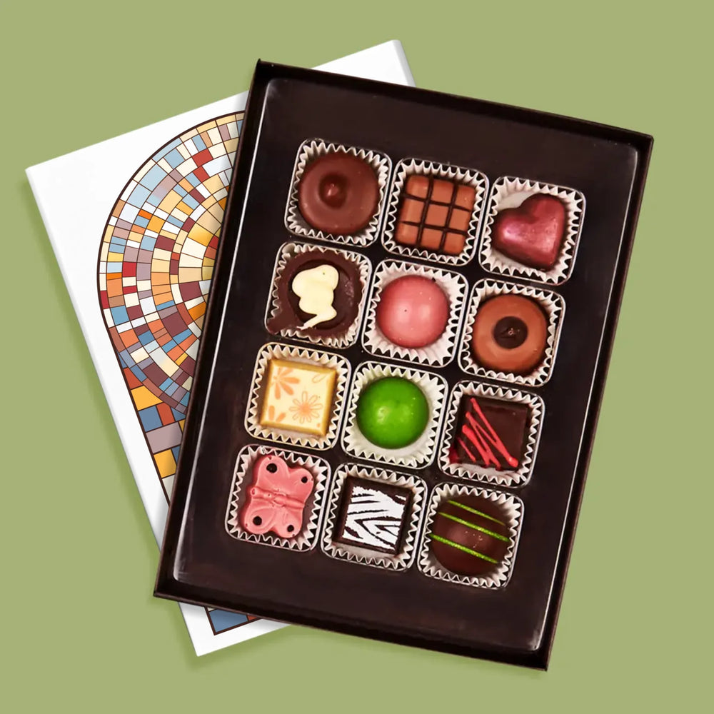 Leckere Pralinen aus belgischer Schokolade in einer eleganten Schachtel, individuell personalisiert.
