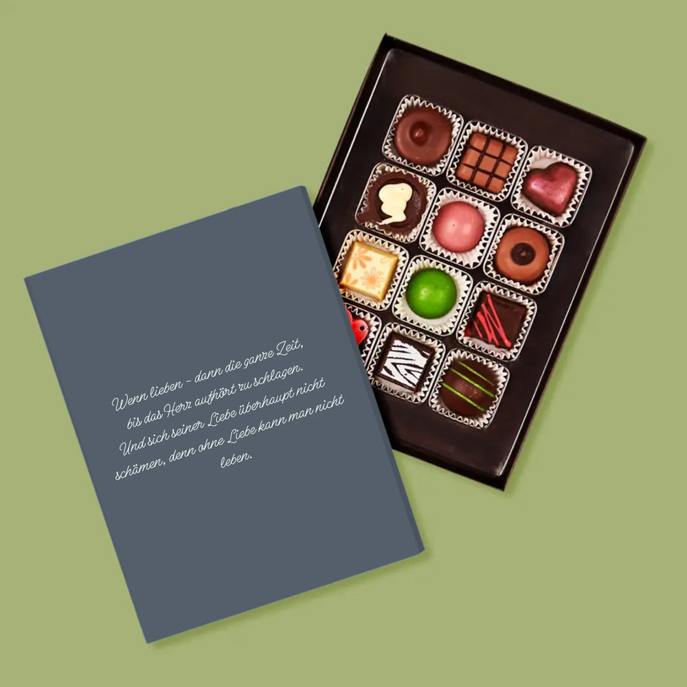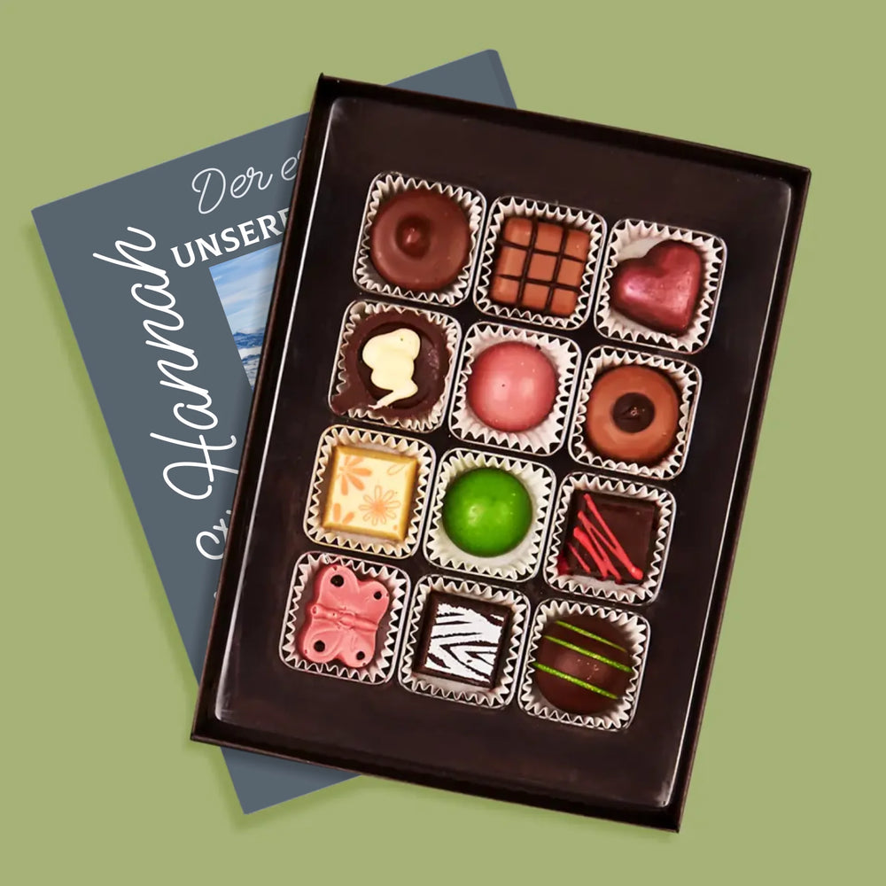 Leckere Pralinen aus belgischer Schokolade in einer eleganten Schachtel, individuell personalisiert.