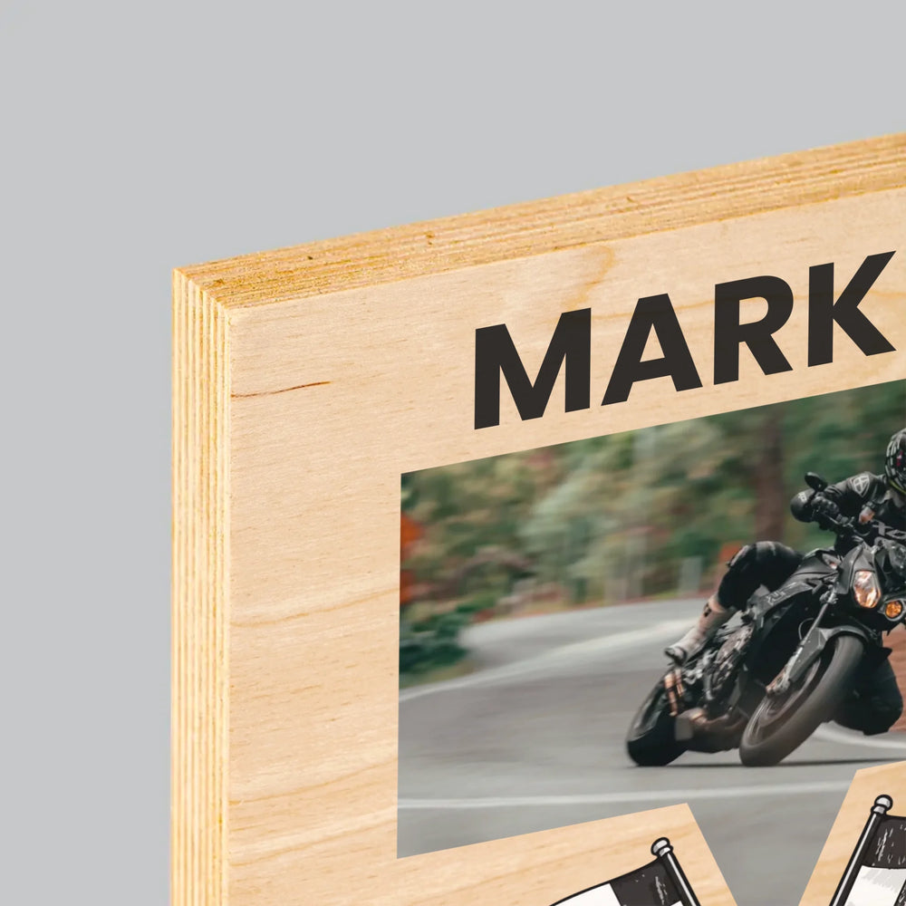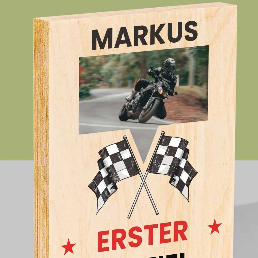 Foto und Unterschrift: Als Erster über die Ziellinie – Druck auf Holz | DE - Druck auf Holz - Vertikal